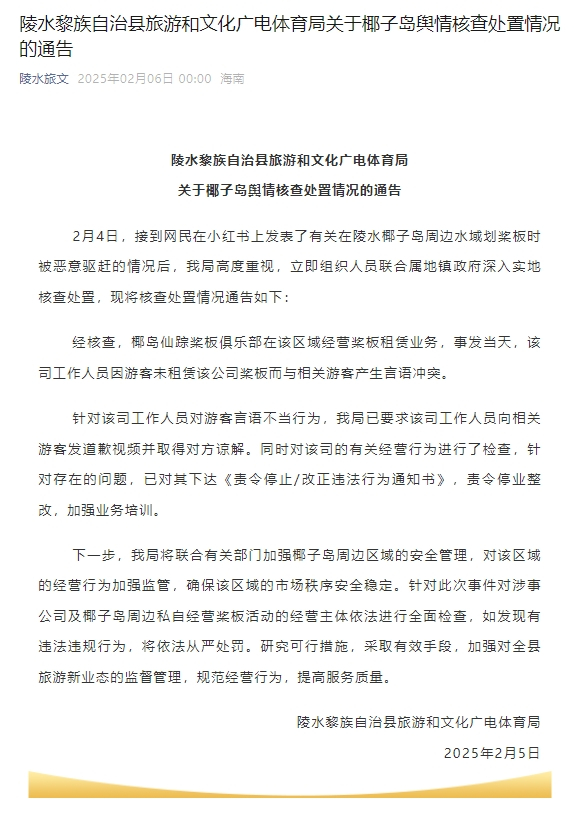 ·游客在海南陵水椰子岛周边水域划桨板时被恶意驱赶?官方通报。