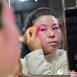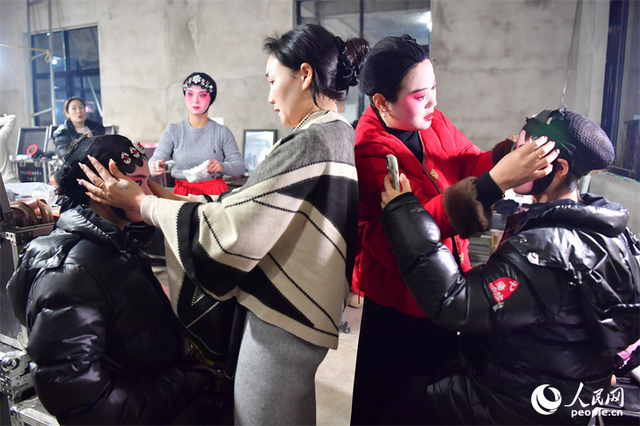 人民网上饶2月6日电(记者时雨)2月5日晚,江西省上饶市鄱阳饶埠镇天堂湖南村张灯结彩,来自弋阳县的老中青演员们在村中的舞台上为村民们上演弋阳腔,铿锵、激昂的锣鼓声,古老、独特的弋阳腔交织在一起,唱响乡村的夜晚,让村民们感受到浓浓年味。图为临时搭建的剧团后台里,剧团演员正对着镜子化妆。人民网记者 时雨摄