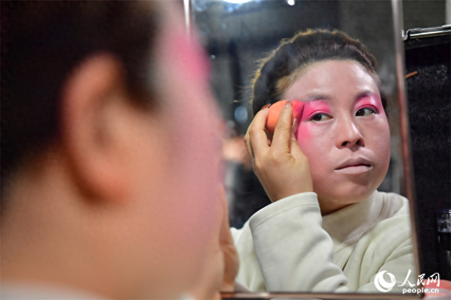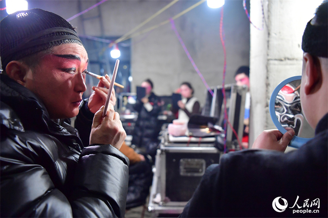 弋阳腔被誉为高腔戏曲“鼻祖”,发源于弋阳县,是国家首批非物质文化遗产。弋阳腔扎根于民间,以其独特的艺术魅力深受广大民众喜爱,从乡村的社火庙会到城镇的勾栏瓦舍,弋阳腔的表演随处可见,成为人们文化生活中不可或缺的一部分。其表演形式灵活自由,注重演员与观众的情感互动,常常出现“一唱众和”的热闹场面,形成强烈的艺术感染力,让整个演出场地沉浸在热烈激昂的氛围之中。图为临时搭建的剧团后台里,剧团演员正在为年轻一代的演员化妆。人民网记者 时雨摄