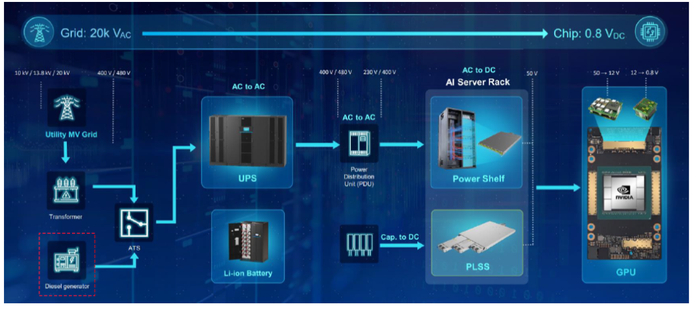 灾备电源是数据中心最后一道用电保障,为数据中心所必需。数据中心普遍采用双电网供电系统,而当两路市电都断电时,UPS逆变器把蓄电池储存的直流电能转化为交流电输出给IT负载,进行短时间快速电力供应。与此同时,灾备电源(目前主要为柴油发电机组)启动,在其顺利启动后,由柴油发电机组进行持续的电力供应。