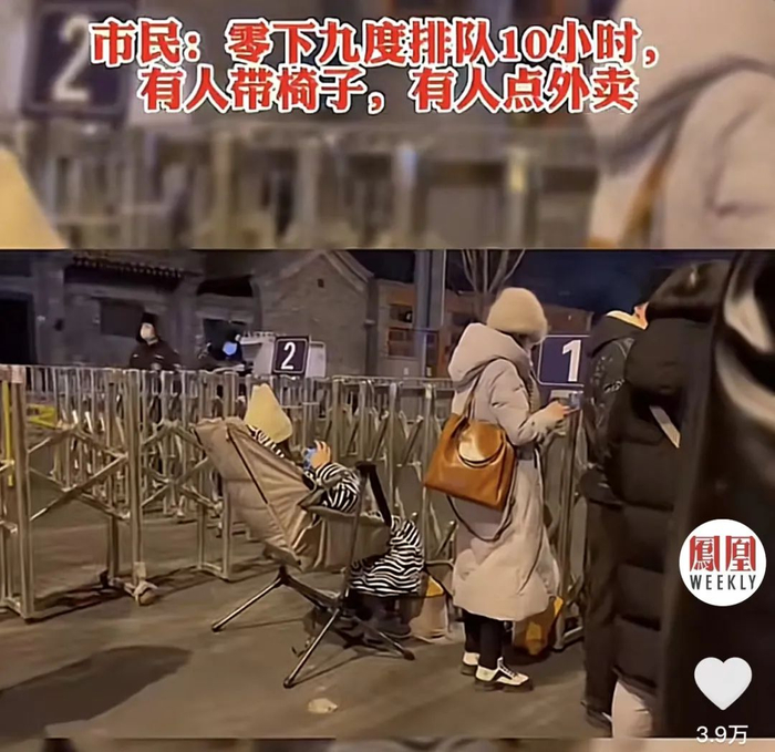 还有人直接户外椅加热水壶,坐在队伍里泡上新年第一杯热茶。