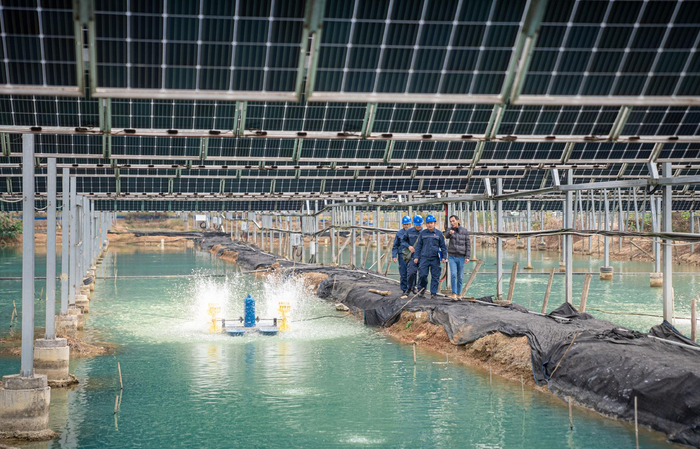 广西贵港桂平蒙圩镇新恒港澳洲淡水龙虾产业示范区,光伏发电与鱼虾养殖业实现了农光一体。