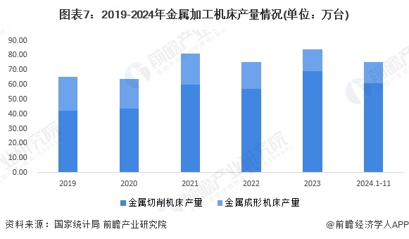 2019-2024年,我国金属切削机床产量波动上升,金属成形机床产量波动下降,2023年,我国金属切削和成形机床产量分别为69.1和15.1万台。2024年1-11月,我国金属切削和成形机床产量分别为61.2和14.4万台。整体来看,我国金属加工机床产量呈波动上升的趋势。