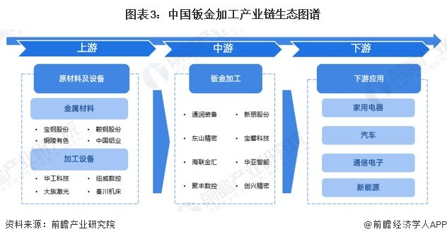 从产业链来看,钣金加工行业的上游是金属材料和加工设备制造,中游是钣金加工;下游是家用电器、汽车、通信电子等钣金加工产品应用领域。
