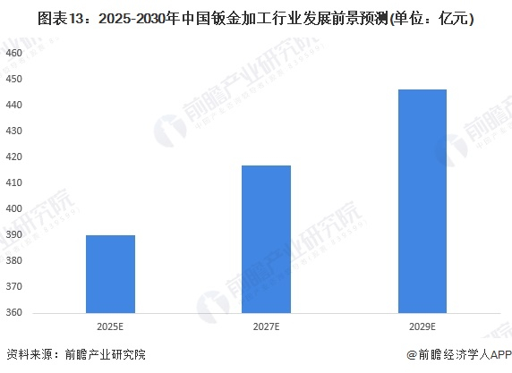 随着中国制造业的崛起,中国钣金及制作行业得以迅速发展。由于钣金产品的应用领域十分广泛,其下游行业几乎包括所有的制造业。在国民经济持续稳定发展的背景下,机电、通讯、金融装备、核电新能源等行业领域持续增长,从而带动本行业产品的市场需求持续增加,行业发展空间广阔。预测2025-2030年中国钣金加工行业年复合增长率在3.4%,到2029年,我国钣金加工市场规模可达446亿元。