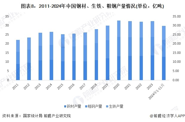 从钣金加工主要原材料钢铁来看,长期以来我国钢材产量均高于粗钢以及生铁产量。2011-2014年,我国钢材、粗钢、生铁产量均呈现逐年增长态势;2014年我国钢材产量增长至11.25亿吨,创下历史记录;2015-2017年受国家供给侧改革、去产能以及房地产投资增速下滑影响,我国钢材、粗钢以及生铁产量均较2014年有所下滑;但随后2018年随着世界经济稳步发展,我国钢铁产量开始回升。2023年我国钢材产量再创新高,达到13.63亿吨,同比增长1.67%。粗钢产量、生铁产量均有微弱上涨,2023年其产量分别为10.19亿吨、8.71亿吨,同比分别增长0.60%、0.83%。2024年1-11月全国粗钢产量9.29亿吨,生铁产量7.83亿吨,钢材产量12.83亿吨。