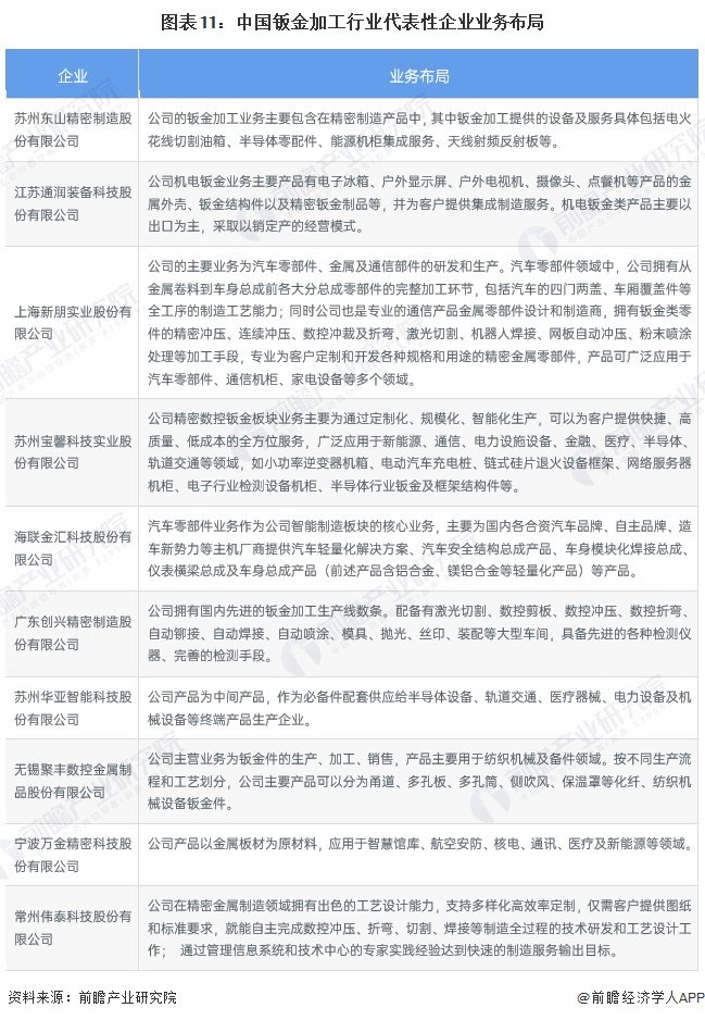 钣金加工行业自产生以来得到了迅速的发展,行业集中度在不断提高,形成了部分规模较大的专业的钣金制造服务商,如东山精密、通润装备、新朋实业等,各代表性企业业务布局如下: