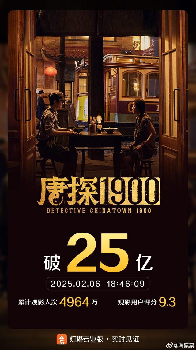 据灯塔专业版实时数据,截至2月6日18时46分,影片《唐探1900》票房突破25亿