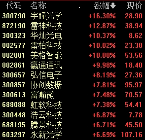 AI眼镜概念股上午大涨,宇瞳光学涨超16%,浩云科技、天键股份、永新光学、雷柏科技等多股冲高。