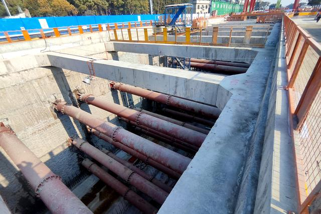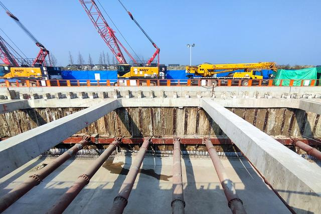 示范区线14标盾构机刀盘顺利下井、二期明挖暗埋段基坑封底
