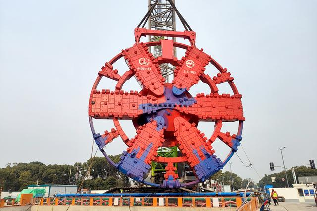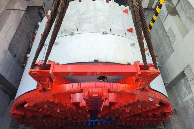 刀盘下井吊装是整个盾构机吊装组装阶段难度最大、危险系数最高的一项工序。为确保顺利吊装,项目团队精心组织、提前筹划,制定周密的施工计划,对相关作业和管理人员进行了细致的安全培训和技术交底。吊装过程中,项目团队采用一台800吨主吊机及一台400吨辅吊机密切配合,将盾构机刀盘从地面缓缓吊起,在空中完成“翻身”动作后,准确下降至始发井预定位置,与盾构机盾身实现精准“合体”。目前,盾构机吊装施工已全部完成,组装工作取得阶段性成果。