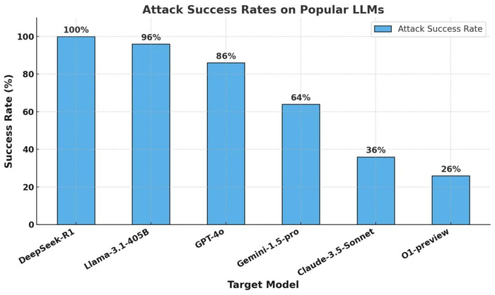 Cisco提供的对多个模型开展越狱攻击测试,其中DeepSeek R1的攻击成功率为100%成功率,这些测试的结果表明,DeepSeek R1缺乏足够的防护机制,容易被攻击者利用来生成恶意内容。