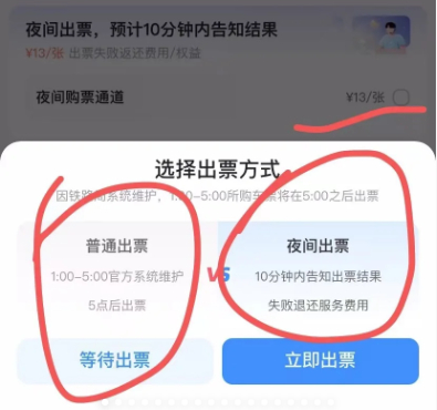 谢婷对此表示不认同,她表示,在支付时,页面仅弹出了“等待出票”和“立即出票”的选项,并未醒目提示选择“立即出票”就需要额外支付13元/张的“夜间购票通道”服务费。