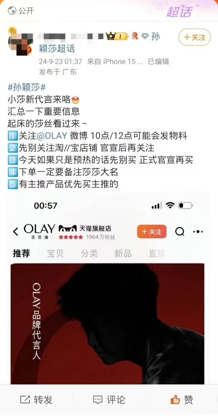 例如,孙颖莎的粉丝“莎丝”对她的商务活动表现出极高的敏感度和关注度。据了解,OLAY、理肤泉官宣前夕,“莎丝”们便已在各大社媒平台自发性地发布详细购买攻略,包括最佳购买时间、备注信息以及优先选购主推品等要点,致力于在官宣当天打出一场“漂亮仗”,让品牌方和其他品牌看到孙颖莎的商业价值。