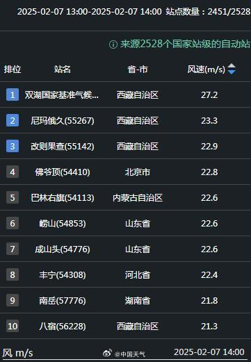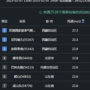 今天下午14时,除青藏高原外,全国风力排名第一的是北京佛爷顶,最大风速达到了22米/秒,也就是9级风(20.8~24.4米/秒)!这速度堪比行驶中的地铁!