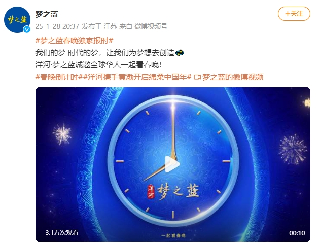 据悉,今年洋河股份赞助了蛇年春晚,由“梦之蓝”进行晚会开场的晚八点整点报时。