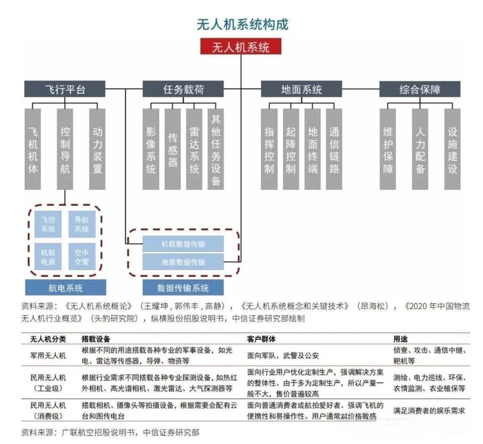 2:分系统端:电动-动力装置领域技术难度较小且产业成熟度高, 大量民营企业在该领域扎根;油动-动力装置领域则主要以生产活塞发动机和生产各类涡轮型发动机为主;航电系统领域,由于无人机在该领域的技术相对开源,所涉技术提供方和制造商众多,同时多数主机厂有能力自给自足,但先进飞控系统仍然是核心壁垒。