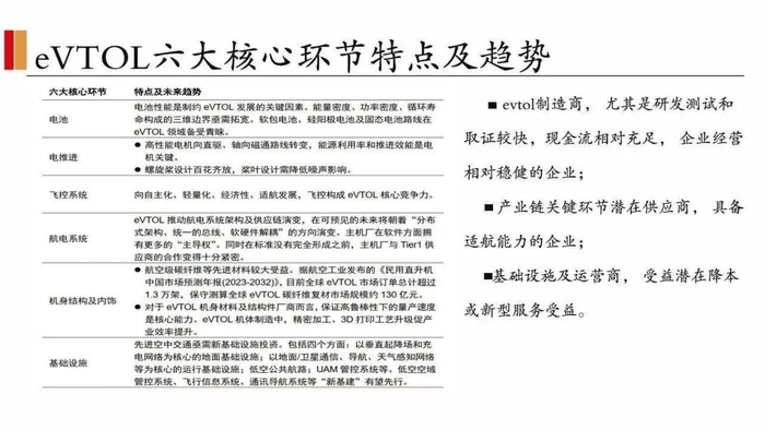 evtol制造商,尤其是研发测试和取证较快,现金流相对充足,企业经营相对稳健的企业;产业链关键环节潜在供应商,具备适航能力的企业;基础设施及运营商,受益潜在降本或新型服务受益。