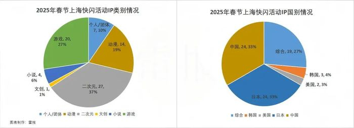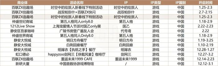 先从IP类型来看,漫展、吃谷集市等二次元IP综合类活动很受欢迎;游戏IP、动漫IP快闪活动贡献大头,分别共计开展20次、14次;以艺术家、插画家、乐队等个人/团体类型的IP活动也有7次。从IP国别来看,中国、日本IP最受欢迎,春节期间分别各自拥有24次快闪活动;二次元IP综合类活动则有19场;韩国IP有3场,美国IP有2场。