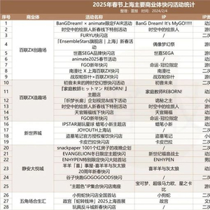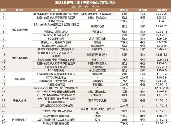 以二次元浓度最高的上海市为例,据雷报不完全统计,2024年内上海的主要商场举办的IP快闪、特展、主题餐厅、主题咖啡店等快闪活动至少有193场(人工统计存在误差)。时间来到2025年春节,短短一周的假期时间,百联ZX创趣场、百联ZX造趣场、新世界城、静安大悦城、五角场合生汇等上海主要的二次元商业体就举办了近30场快闪;加上其他商业体正在或即将举办的快闪类活动,上海地区2025年前两个月就将推出共计73场线下活动。