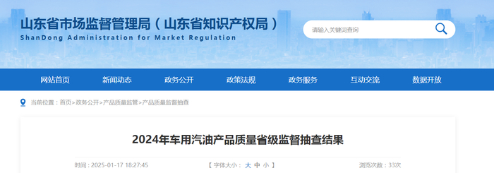 山东省市场监管局发布2024年车用汽油产品质量省级监督抽查结果