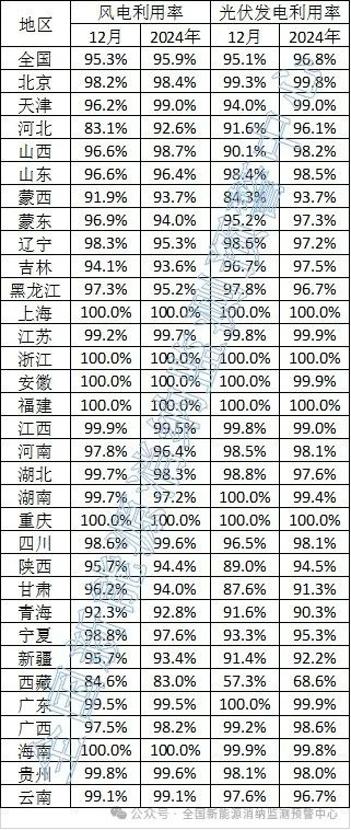 2月6日,全国新能源消纳监测预警中心公布了2024年各省级区域新能源并网消纳情况。12月,全国光伏利用率95.1%,1-12月全国光伏利用率96.8%。