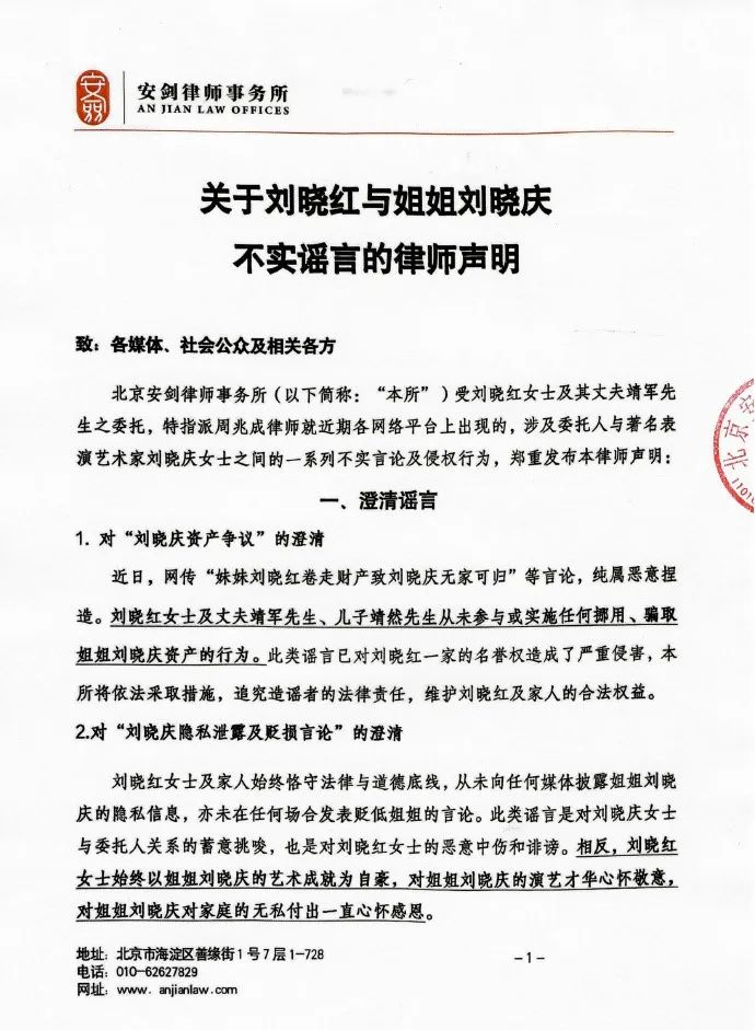 7日中午1时许,刘晓红、靖军夫妇的代理律师周兆成也发布了律师声明。声明中,对家庭经济、财产和税务等方面的谣言进行了澄清,并表示网络传言是对亲情的亵渎。针对网上各种不实言论的持续传播,也已依法进行了取证工作。
