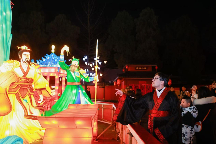 此次武侯祠成都大庙会首次推出以三国故事为主线的主题灯组,将桃园三结义、舌战群儒、空城计等群众耳熟能详的故事,打造为游客可感知、可触摸、可领悟的沉浸式体验新场景,令游客们眼前一亮。“整个游览过程充满惊喜与探索的乐趣,尤其草船借箭的灯组,还有水雾在飘动,太逼真了!”杨英健称赞道。
