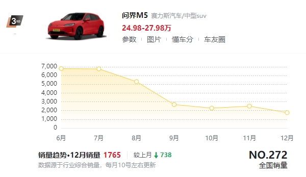 懂车帝的销量数据显示,问界M5的销量从去年7月开始一路下滑,从去年7月的单月6768辆,下滑至去年12月的单月1765辆。售价40万元以上的问界M9已经成为问界销量的主要来源,而处在主流豪华新能源汽车价格区间的M5和M7对问界的销量贡献力度则在减弱。