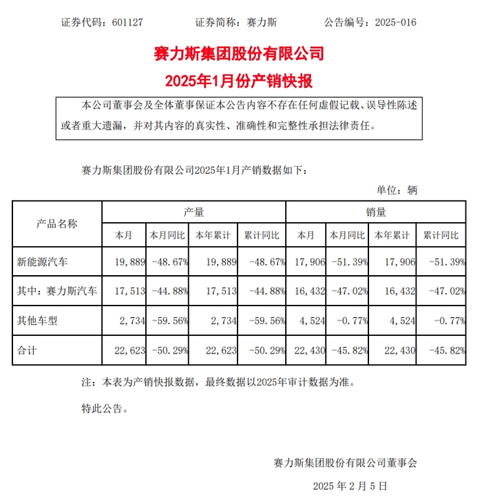 2025年2月4日,赛力斯(股票代码:601127.SH)公布了2025年1月产销快报数据。数据显示,赛力斯在2025年1月的销量为17906辆,同比下滑51.39%。