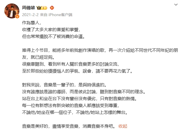 谈及互联网时代的流量,周传雄认为:“如果只是为了流量去做一些事情,那就会让你离自己真正想做的事情越来越远。对我来说,流量来就来,没有就没有,都没关系。”