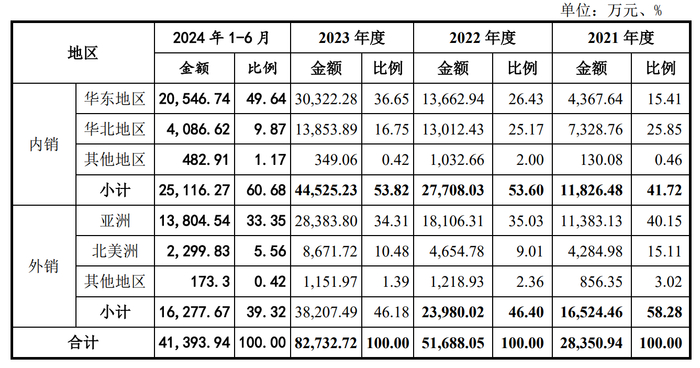 泽润新能另一个难以忽视的特征是海外收入占比较高,据招股说明书数据,2021-2023年及2024年上半年公司营收中外销占比分别为58.28%、46.40%、46.18%、39.32%,境外收入高出同业平均13个百分点左右。