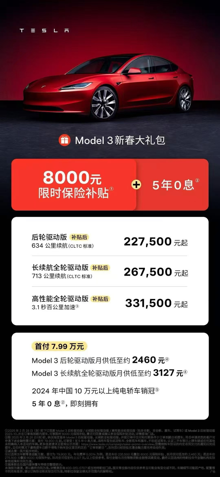 2月5日,特斯拉针对Model 3推出限时保险补贴8000元、5年0息政策及特享充电权益,保险补贴首次覆盖Model 3全系车型。同日,小鹏汽车宣布“五年0利息0首付”购车政策,至高贴息57000元,覆盖小鹏X9、G9、P7i和G6等车型。此前,蔚来已于2月2日开启5年0息政策。