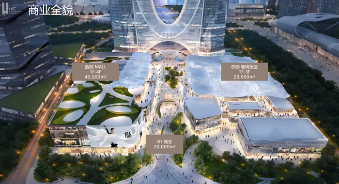 其中海雅缤纷天地是项目的商业部分,体量24万㎡。空间上,打造了街区天幕、下沉广场、中庭垂直森林、屋顶花园、流光溪谷等空间,实现自然生态与商业空间的融合。业态上,涵盖时尚品质生活、人文艺术先锋、潮流体验发生、生态科技互联、24小时经济五大特色业态。