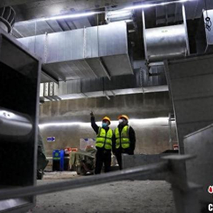 2月7日,工人在北京地铁17号线永安里站内进行施工。中新社记者 赵文宇 摄