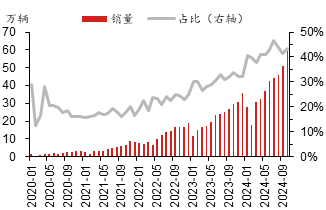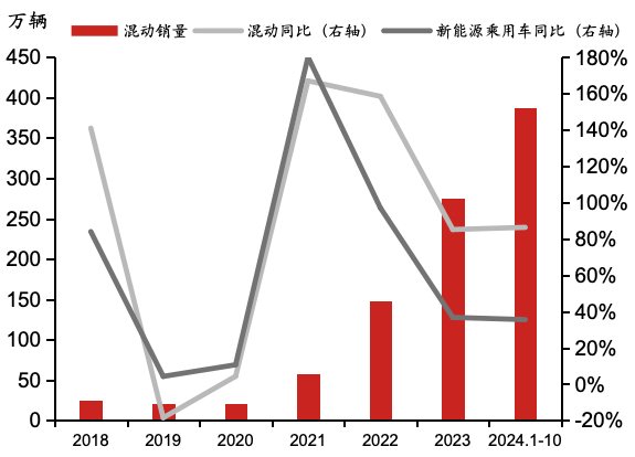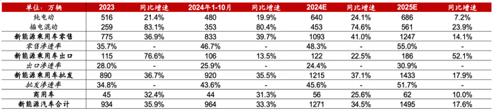 供给增加推动混动市场高速发展。我们认为里程焦虑仍是新能源汽车购买人群的主要考虑因素,混动车型在使用端和成本端的双重驱动下,2024年前10月增速表现远超新能源汽车整体增速。同时2025年混动市场也迎来供给端的扩容,一方面,本身在插混领域具备较强竞争力的车企积极进行技术迭代和产品升级,另一方面,越来越多的新势力车企也计划推出增程产品,我们认为混动市场有望在2025年延续高速增长。