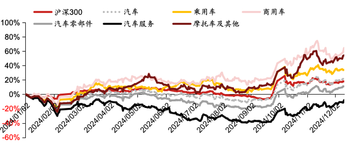 2024Q1汽车行业需求较为低迷,主要受到2023年刺激政策透支和春节假期的影响,同时车企加大去库力度,经销商也持观望态度;3月汽车以旧换新等政策相继出台和比亚迪“荣耀”系列上市,从政策端和供给端进一步激发市场活力,需求开始企稳。2024Q2新能源车企加大终端促销力度或通过换代改款产品进一步拉低价格,行业竞争加剧,但也刺激了销量上升。2024年8月底,“以旧换新”新政对汽车销量的刺激开始显现,并推动汽车板块率先大盘企稳回升。9月开始汽车市场恢复强劲上涨动能,新能源汽车渗透率持续刷新历史高位,汽车市场呈现高景气度。