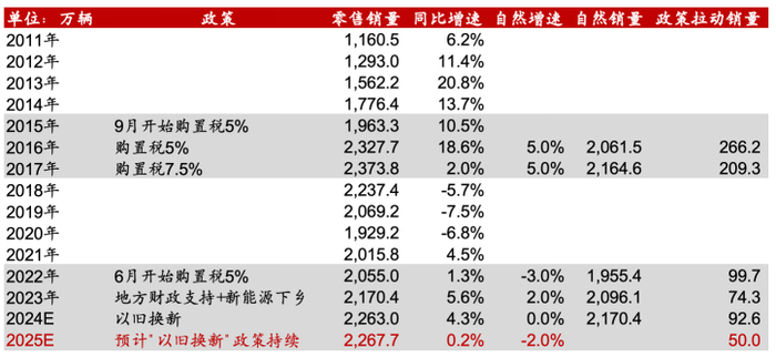 注:自然增速是指假设不存较大刺激政策出台的情况下,预计当年的销量增速水平,长期按照全球GDP增速2-5%。2022年中国经济受疫情影响较为严重,自然增速采用2018-21CAGR,以反映疫情对整体车市的影响。2023年中国车市从疫后恢复,同时综合宏观经济环境、车市竞争状况和以旧换新政策,采用2%自然增速。由于2022-2023年连续两年的政策刺激,对后续年份的销量存在透支,假设2024年自然增速为0,2025年自然增速为-2%。