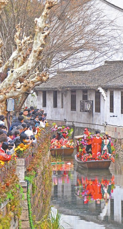 浙江绍兴市上虞区丰惠老街,江南传统婚俗表演吸引了不少游客观看。