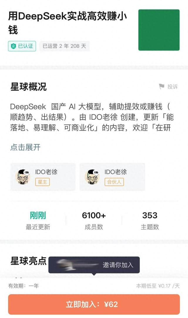 记者在付费知识社群“知识星球”App上发现,“用DeepSeek实战高校赚小钱”排名星球财富周榜第一,打开发现该社群有超过6000+成员,加入需要交费62元。该社群介绍称,群主是资深程序员,在这里会毫无保留地分享使用技巧,结合实际案例,教大家如何利用DeepSeek抓住AI机遇,无论是提供工作效率亦或者是用AI副业变现,你都可以在这里得到答案。至于如何用DeepSeek赚钱,该社群也很直接的表示,“可以卖DeepSeek资料、课程,提供DeepSeek付费咨询等等”,并且还支持3天内退款。