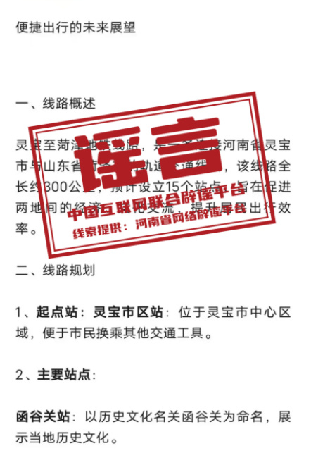 真相:近日,有自媒体账号在互联网平台发布“灵宝到菏泽的地铁”相关信息,称“该线路全长约300公里,预计设立15个站点”“起点站为灵宝市区站,位于灵宝市中心区域”,引发关注。经核实,该消息系虚假信息。互联网不是法外之地,请自觉遵守法律法规,不造谣、不信谣、不传谣。(来源:“清朗河南”微信公众号、网信灵宝)