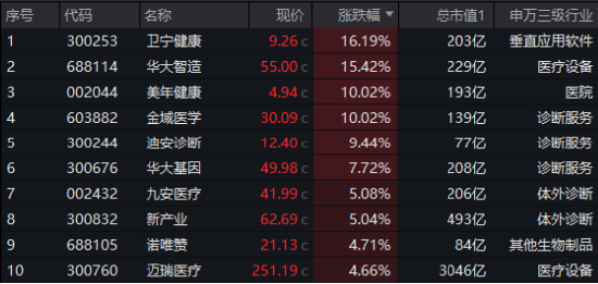 从成份股涨跌分布来看,当日AI医疗相关个股集体飙升,卫宁健康涨16.19%,华大智造涨15.42%,美年健康、金域医学双双涨停封板!迪安诊断、华大基因、九安医疗、新产业等大幅跟涨,3000亿器械巨头迈瑞医疗涨4.66%。