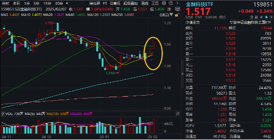 热门ETF方面,金融科技ETF(159851)全天高位运行,场内价格收涨3.34%创2025年以来新高,日线三连阳站上所有均线,单日放量成交超11亿元,换手率超24%,交投高度活跃。资金大幅回流,Wind实时申购数据显示,金融科技ETF(159851)当日获资金净申购4200万份!
