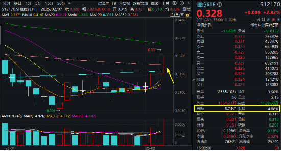 DeepSeek的风终于吹到医疗!周五,AI医疗强势爆发,带动医疗ETF(512170)放量摸高3.76%!截至收盘,医疗ETF(512170)场内收涨2.82%,一举站上半年线和年线,全天成交8.74亿元,较前一日激增近五成。