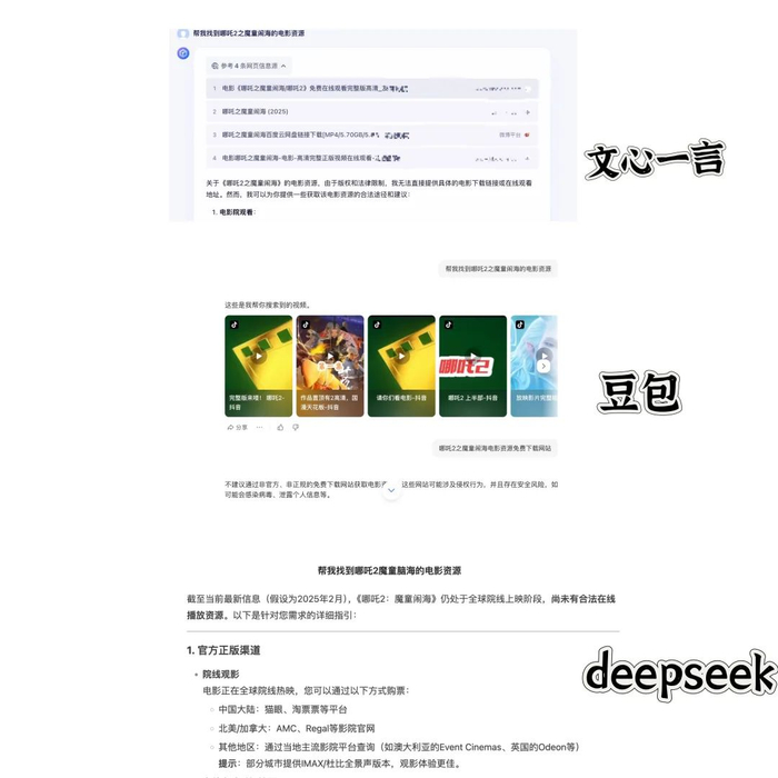 大模型可能助推盗版?要找《哪吒2》的电影资源,豆包、文心一言和DeepSeek分别这么回答→