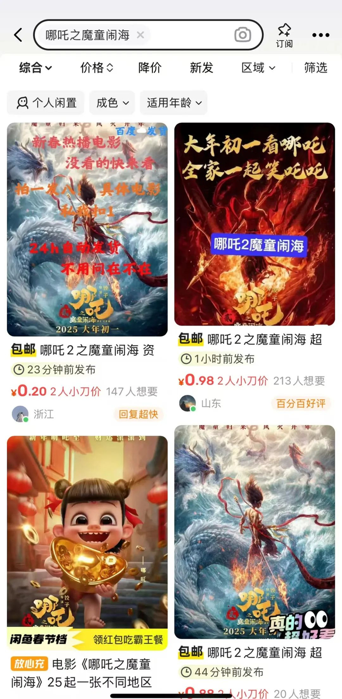 灯塔数据显示,目前《哪吒2》的平均票价为47.6元,而记者查看闲鱼发现,许多标注《哪吒2》资源的链接正在不断上架,价格低至0.2元至4元不等,一个售价0.2元的资源链接,仅发布23分钟就有147人“想要”。在拼多多、淘宝等电商平台,也有一些标注《哪吒2》电影完整版、虚拟网盘发货的链接,其中一件售价4.86元,显示已抢657件。
