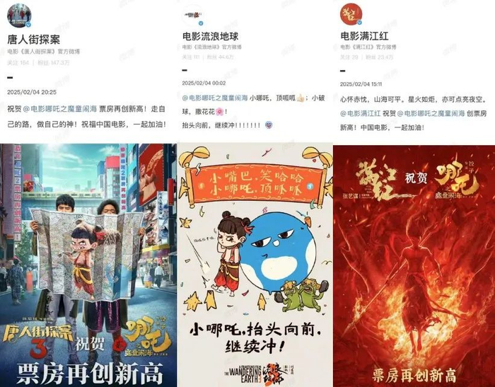 《哪吒之魔童闹海》票房创新高,@唐人街探案 @电影流浪地球 @电影满江红 纷纷发文祝贺