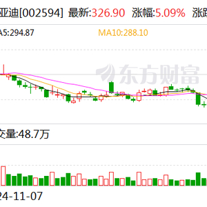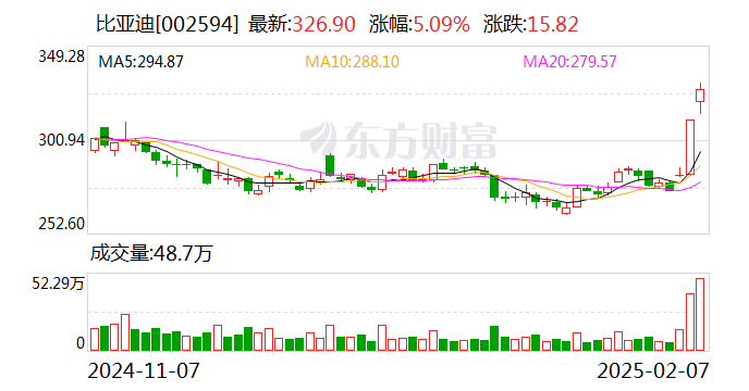 截至2月7日收盘时,比亚迪收涨5.09%,报326.9元,总市值达到9265亿元。