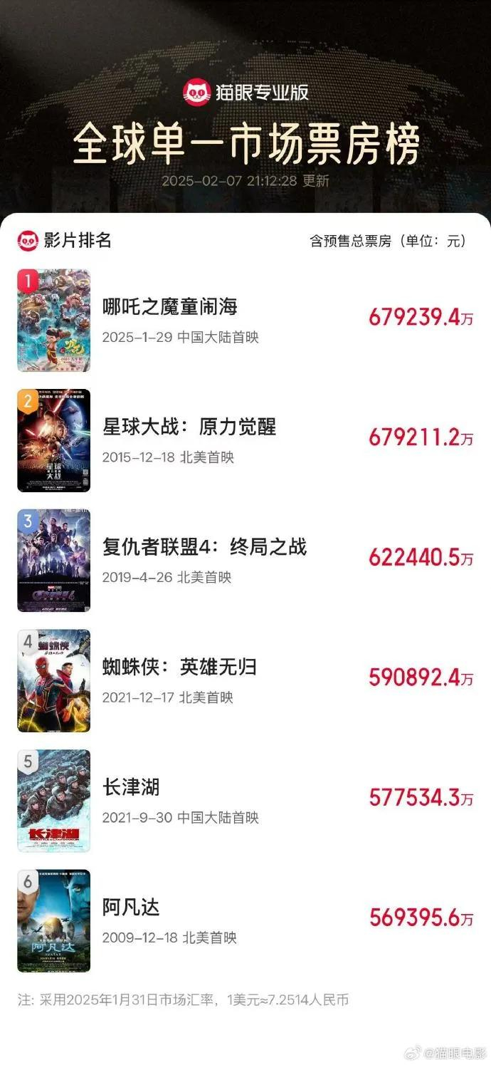 央视新闻消息,据网络平台数据,截至2月7日21时,电影《哪吒之魔童闹海》票房(含预售)突破67.922亿,超过《星球大战:原力觉醒》票房成绩,登顶全球影史单一市场票房榜!