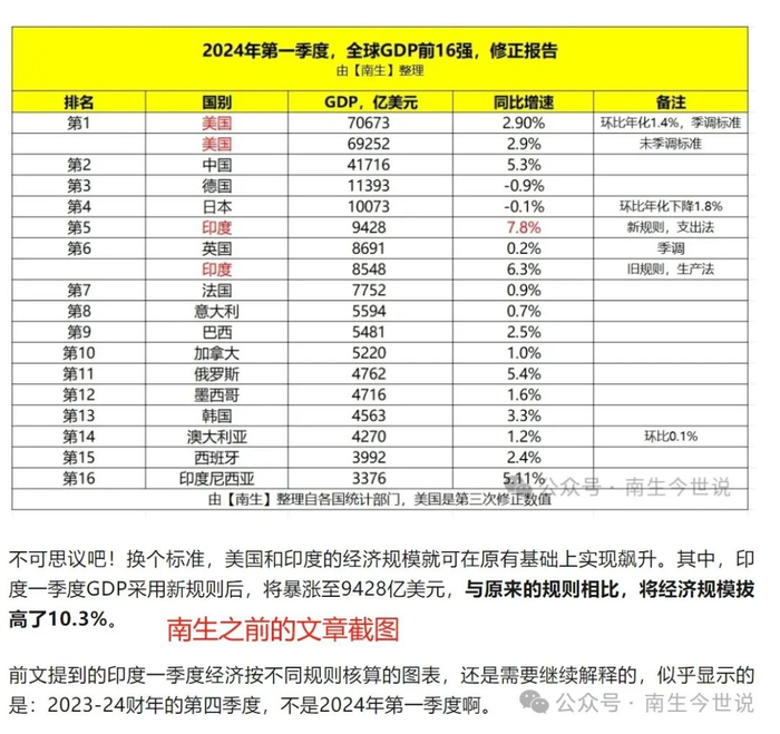 南生曾以2024年第一季度为例,引用了印度国家统计局公布的国民经济核算报告,里面有采用完善后的GDP核算规则下的数据,也公布了原来的生产法规则下的数值,两种规则下的差额超过10%。
